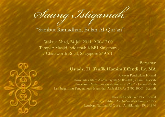 Alhamdulillah, Insya Allah minggu depan akan ada acara Saung Istiqomah lagi nih, acara pengajian bulanan hasil kerjasama KBRI Singapura dan IMAS (Indonesia Muslim Association in Singapore) Dan kali ini, Saung Istiqomah bakalan tampil spesial loh
