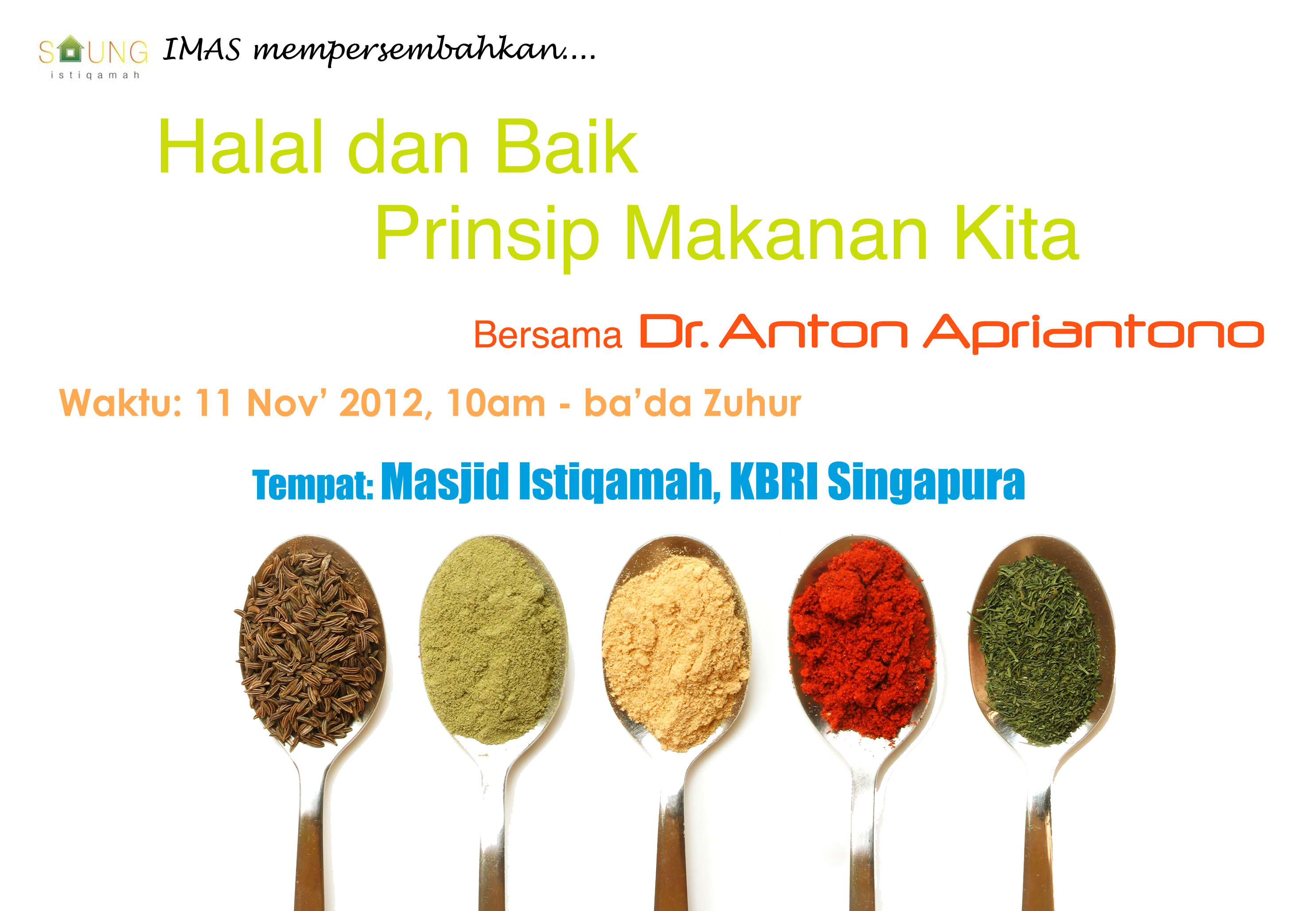 Alhamdulillah, Insya Allah minggu depan akan diadakan Saung Istiqomah, acara pengajian bulanan hasil kerjasama KBRI Singapura dan IMAS (Indonesia Muslim Association in Singapore). Detail acaranya sebagai berikut: