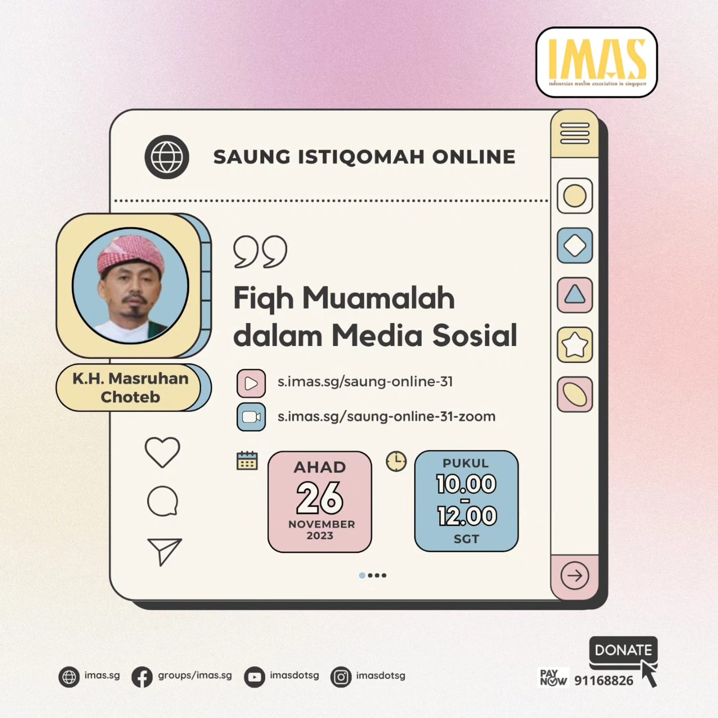 Dengan adanya bimbingan untuk bermuamah dalam Media Sosial kita bisa menjaga hubungan baik sesama manusia (Habluminannas) tanpa merusak hubungan kita dalam bermasyarakat. Untuk itu IMAS akan mengadakan Saung Istiqomah Online yang bertajuk: