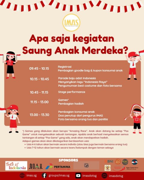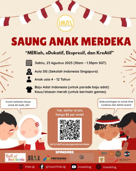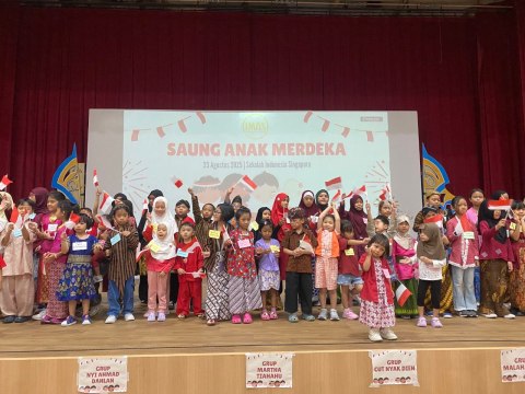 Alhamdulillah, Saung Anak Merdeka (Meriah, Edukatif, Ekspresif, dan Kreatif) diikut dengan antusias oleh anak-anak usia 4 sampai 12 tahun. Acara dilaksanakan di Aula Sekolah Indonesia Singapura (SIS).